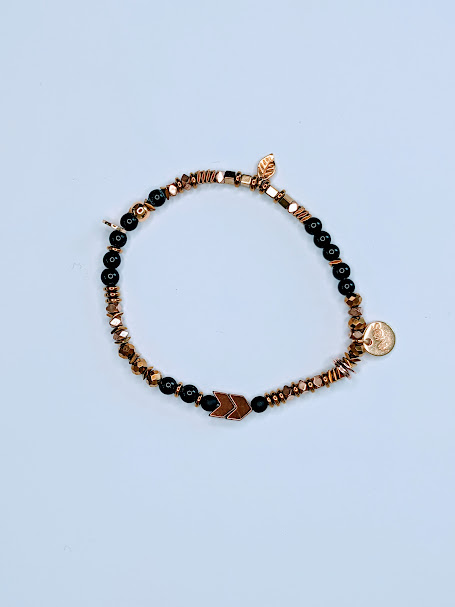Bracelet extensible @amoscreation sur lequel est monté un assortiment d’éléments en pierre naturelle d’hématite, accompagnées d’une petite touche d’acier doré et de pierres onyx noires.